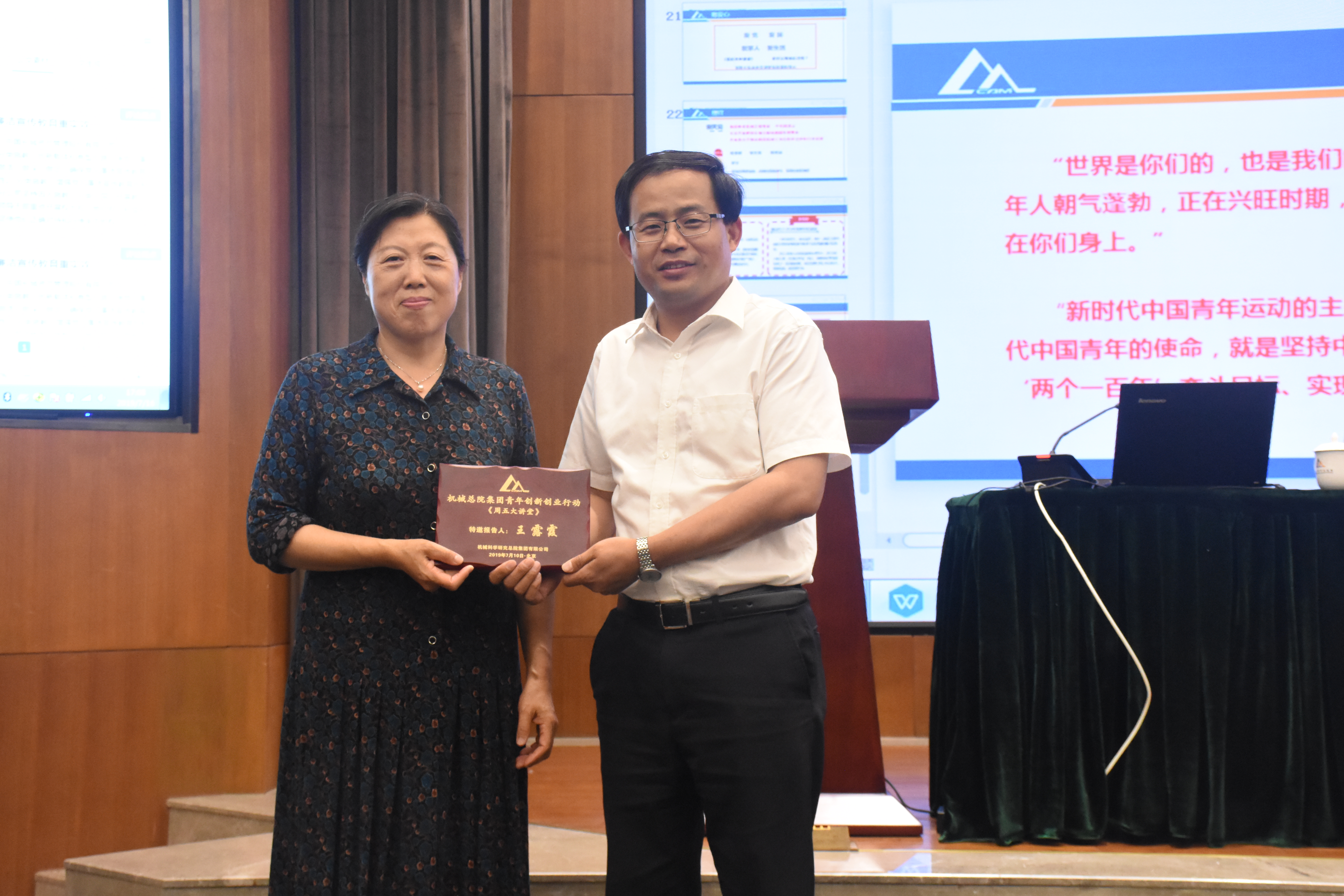 716日下午,人資部和機械總院集團團委共同舉辦了2019年第六期周五大講堂,本次講堂邀請到原機械總院黨委副書記、紀委書記、副院長王露霞同志,做題為建功立業新時代的主題講座,集團單忠德副總經理主持并為王露霞老師頒發紀念獎牌,總院集團及在京各二級單位七十余名研究生、青年員工聆聽了本次報告。